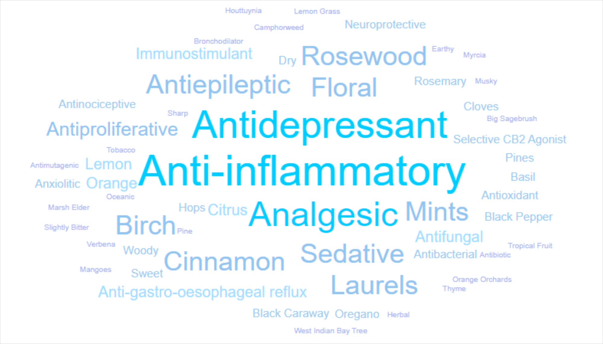 This word cloud represents general flavors, sources and possible effects based on the terpenes present. It is unscientific and should not be used treat or diagnose any condition.