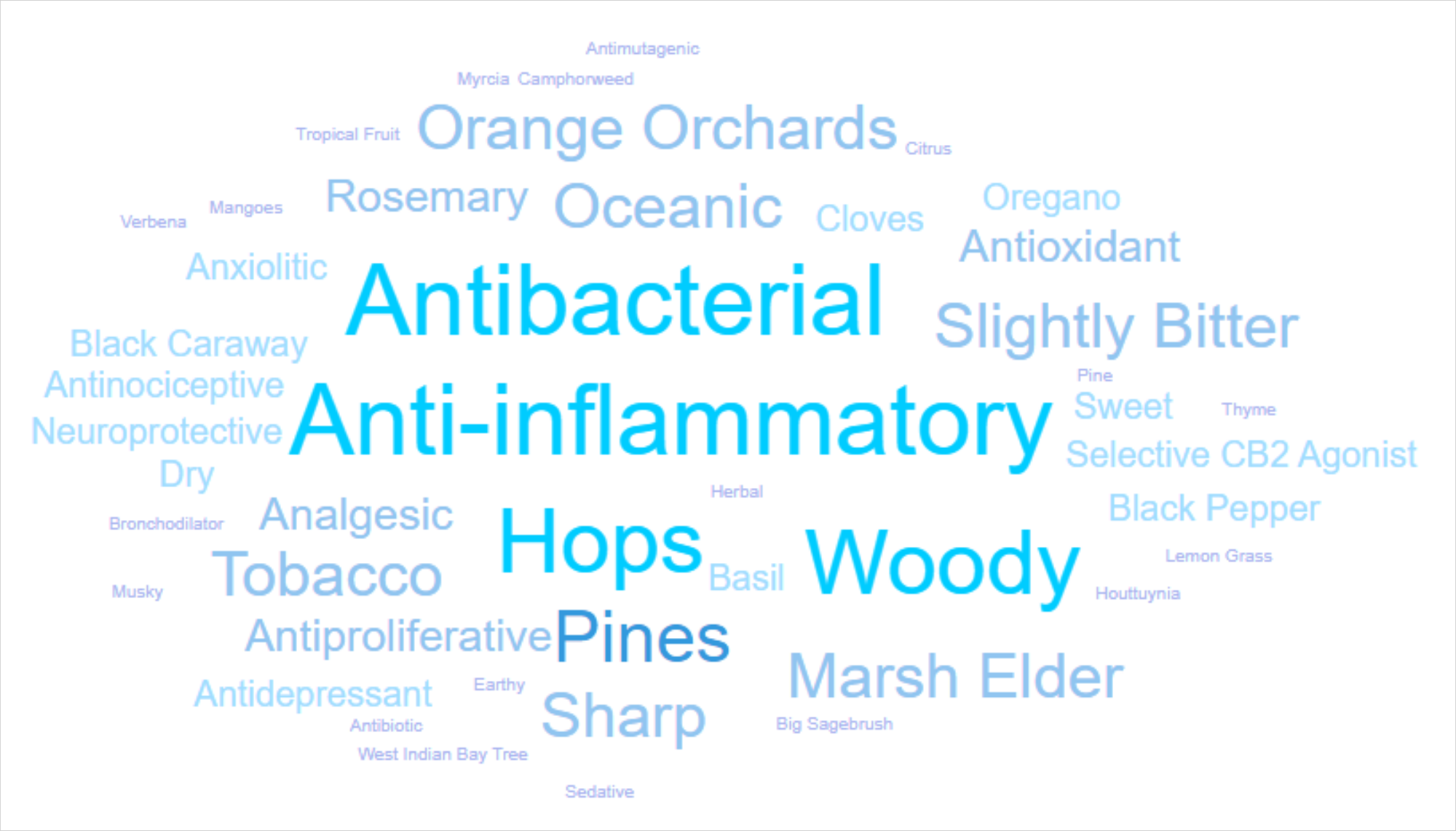 This word cloud represents general flavors, sources and possible effects based on the terpenes present. It is unscientific and should not be used treat or diagnose any condition.