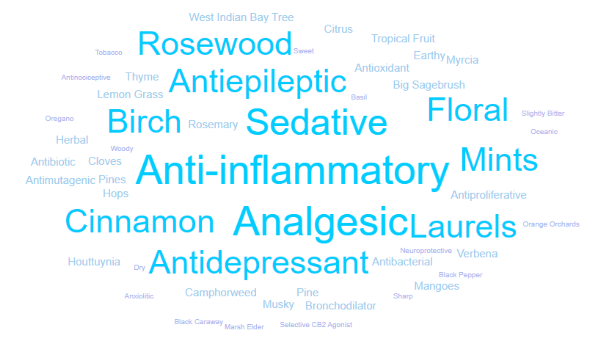 This word cloud represents general flavors, sources and possible effects based on the terpenes present. It is unscientific and should not be used treat or diagnose any condition.