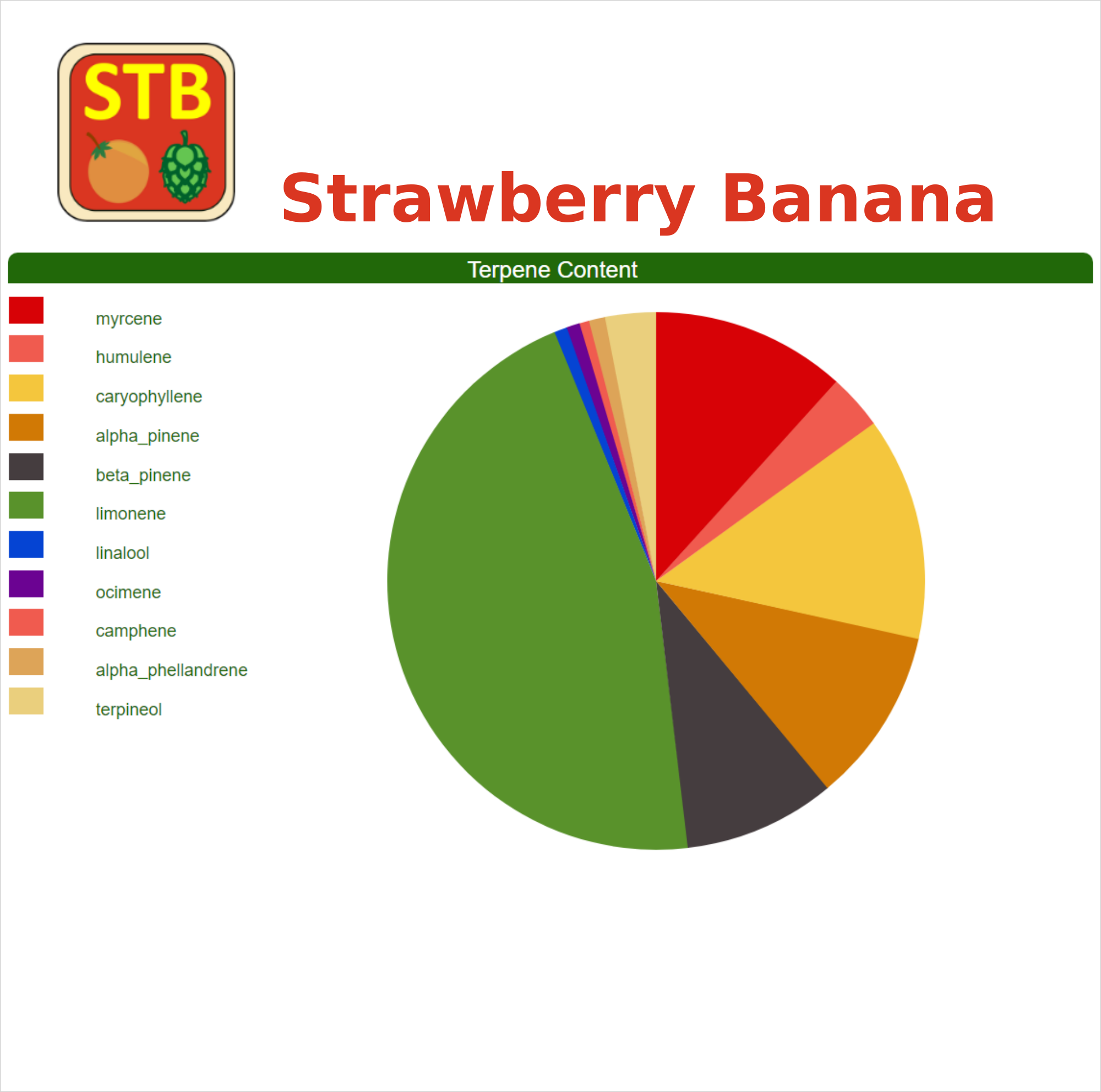 Limonene, Caryophyllene, Myrcene, Alpha Pinene, Beta Pinene, Humulene, Terpineol, Alpha Phellandrene, Ocimene, Linalool, Camphene