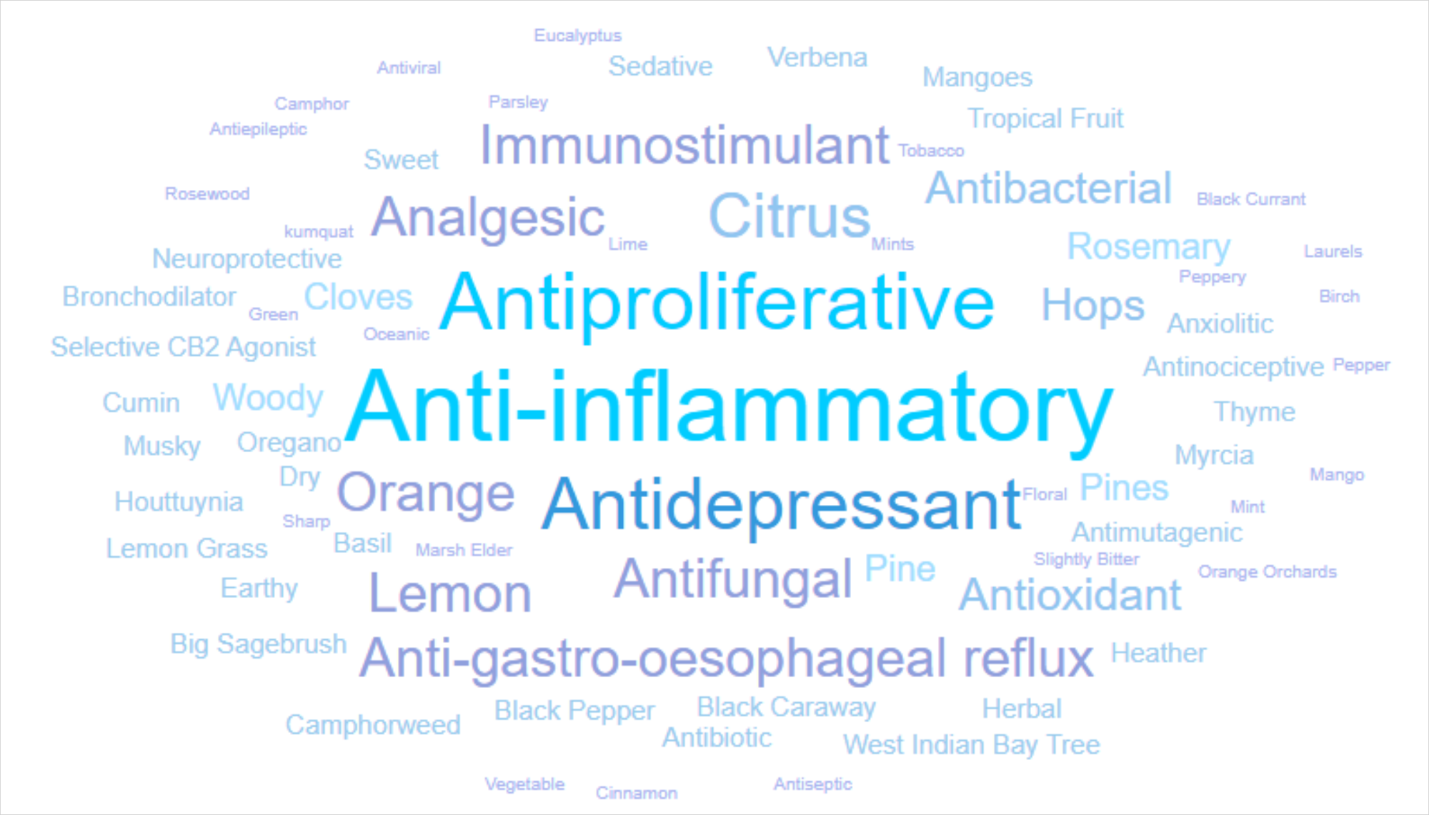 This word cloud represents general flavors, sources and possible effects based on the terpenes present. It is unscientific and should not be used treat or diagnose any condition.