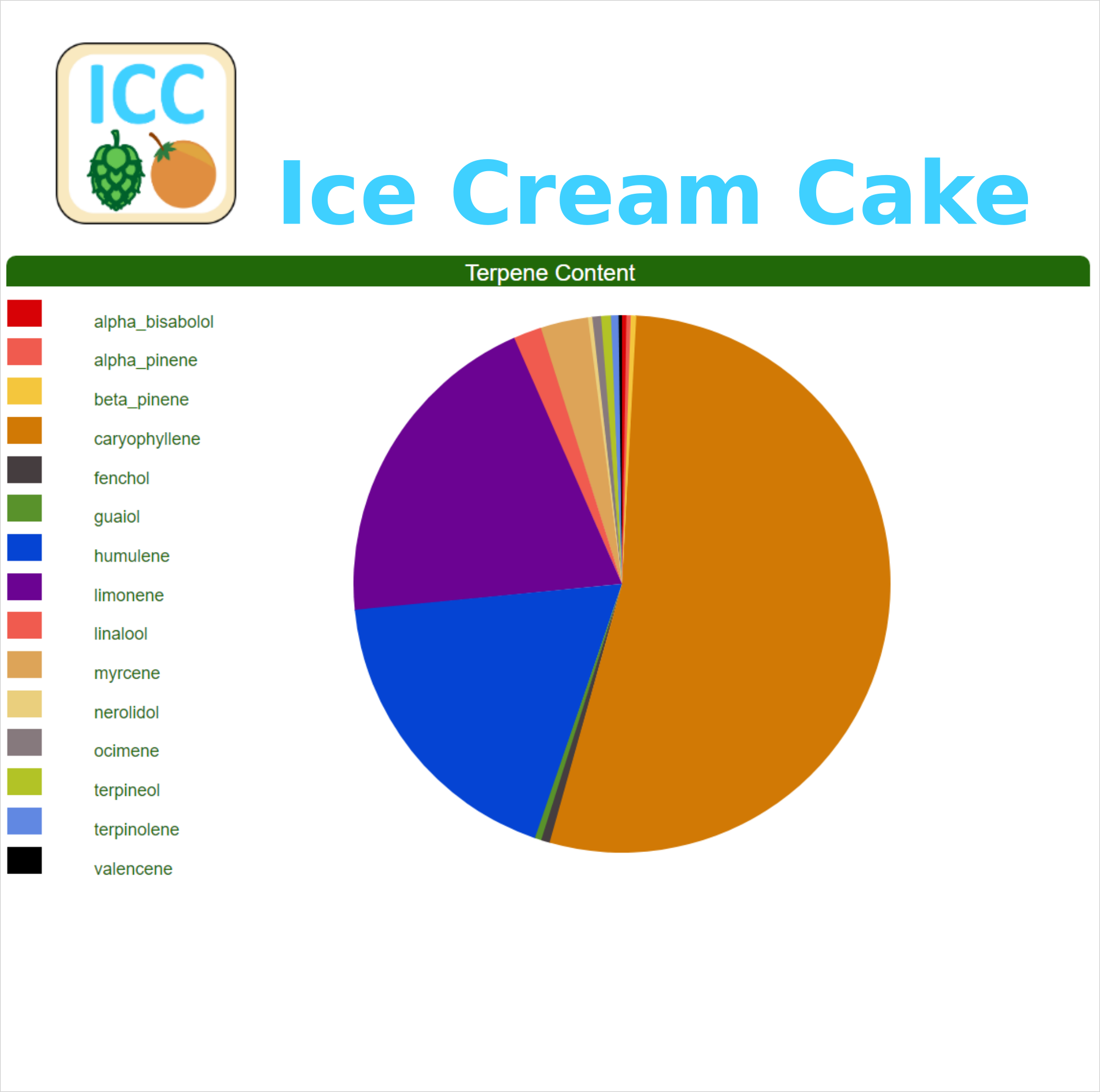Caryophyllene, Limonene, Humulene, Myrcene, Linalool, Terpineol, Ocimene, Fenchol, Terpinolene, Guaiol, Beta Pinene, Nerolidol, Alpha Bisabolol, Alpha Pinene, Valencene
