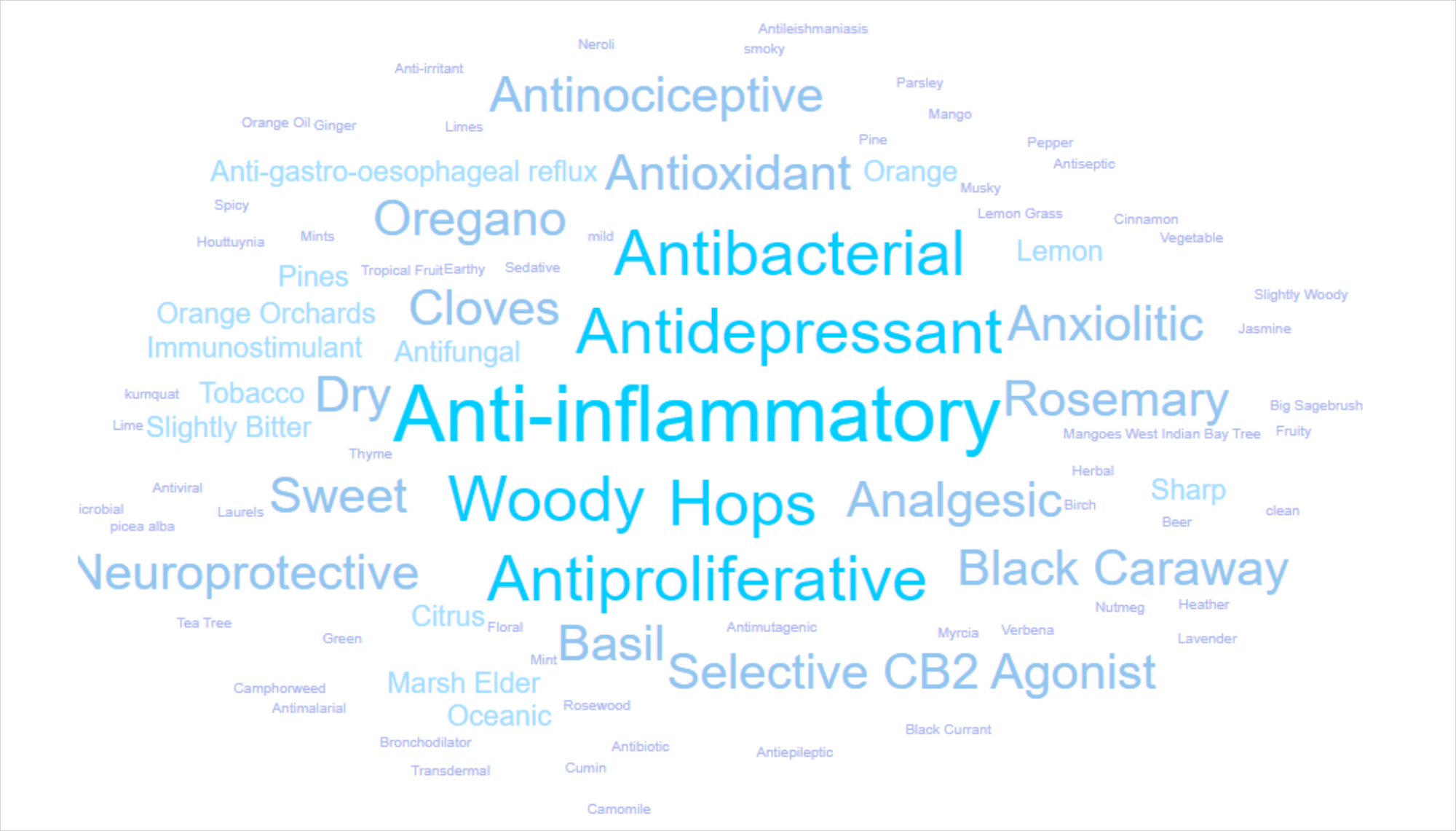 This word cloud represents general flavors, sources and possible effects based on the terpenes present. It is unscientific and should not be used treat or diagnose any condition.