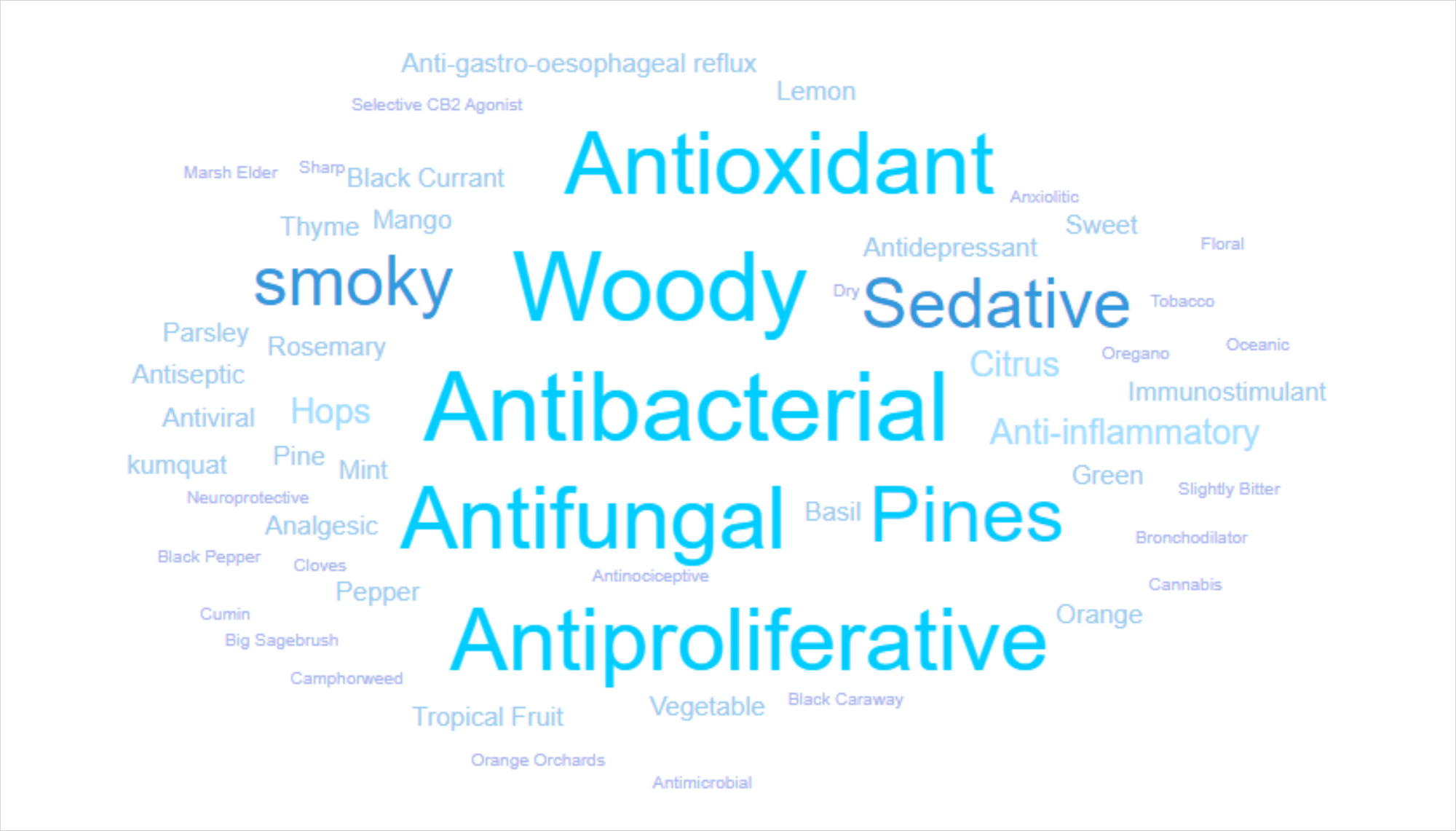 This word cloud represents general flavors, sources and possible effects based on the terpenes present. It is unscientific and should not be used treat or diagnose any condition.